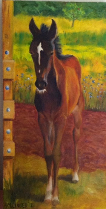 Cisco was an adorable but rather naughty little fella. He had a look of pure mischief in his eyes. You never knew when he would suddenly kick up his heels and go scrambling away fast. And you weren't sure if he was going to try to take a nip out of you. I felt like this painting caught his look. You know, seeing his eyes, that he's getting ideas about what mischief he can cause. But what a beautiful baby he was, with that telling tornado on his forehead. He was so frisky and cantankerous that he was sold to friends of my son and wife. It was sweet while it lasted, but with him taken on by another enthused owner, they could relax and enjoy the other better-behaved horses!
